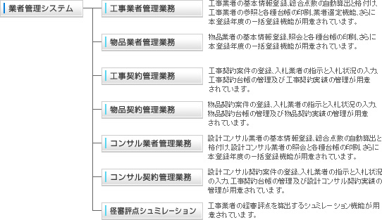当システムは、この業者登録業務(工事業者、物品業者、設計コンサル業者)と契約業務(工事契約、物品契約、設計コンサル契約)を支援するものです。